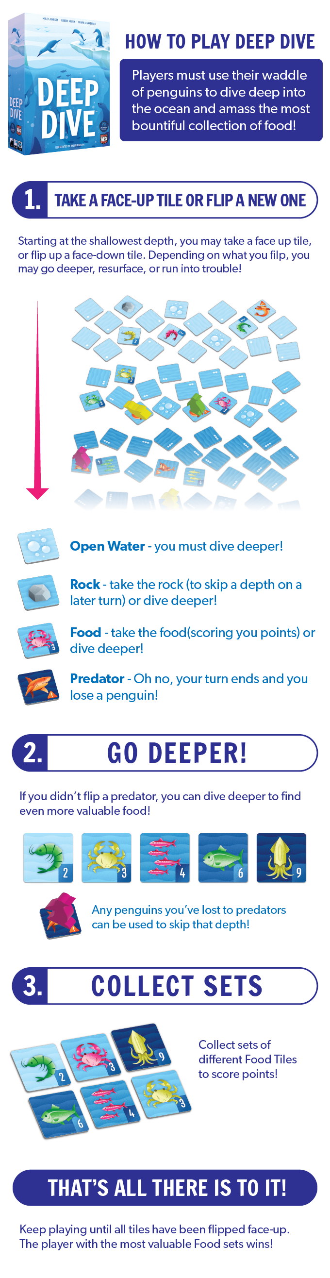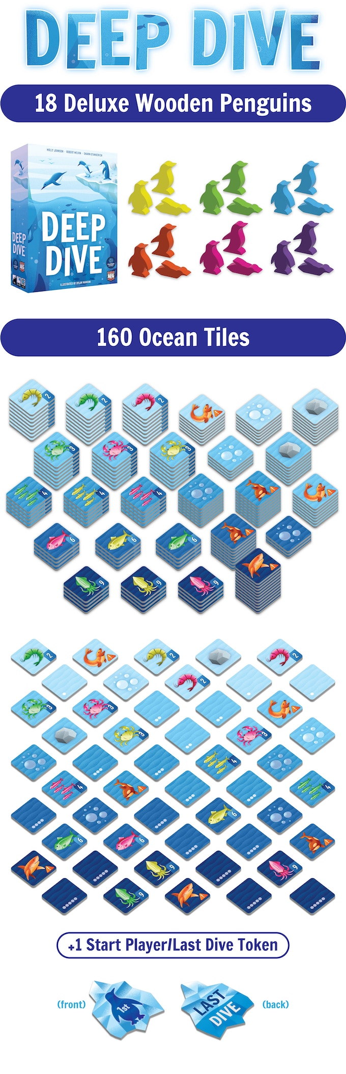 Deep Dive is a press-your-luck set-collection game in which you use your waddle of penguins to dive deep into the ocean to amass the most bountiful collection of food!