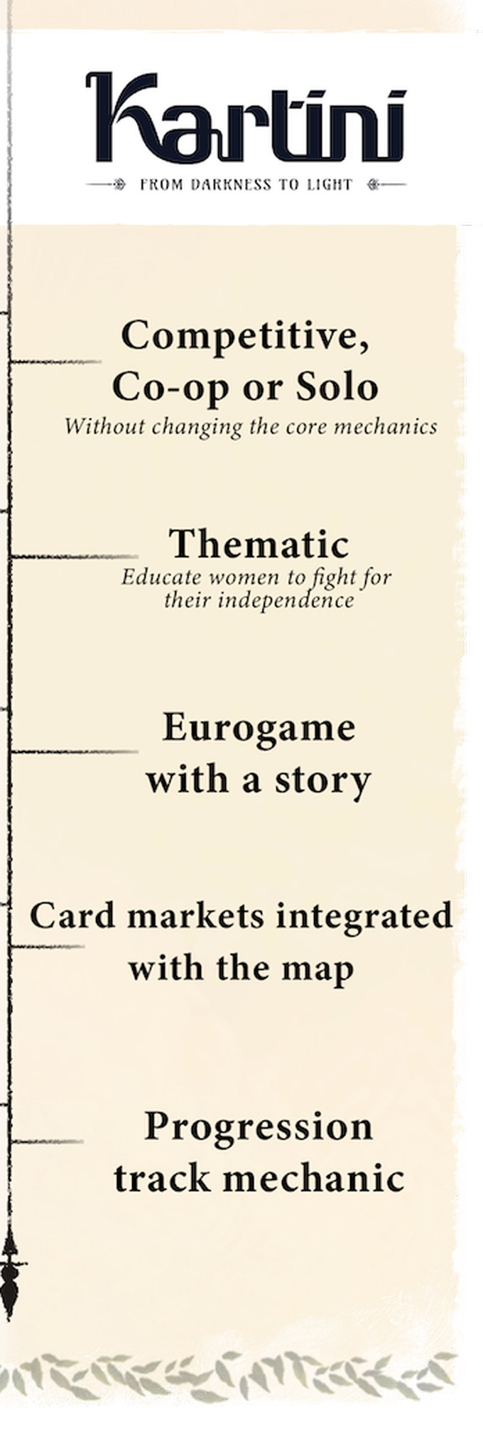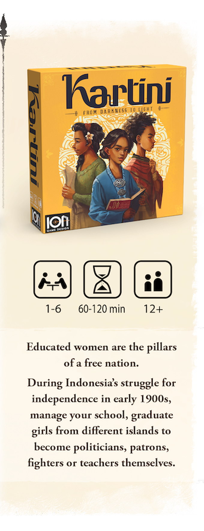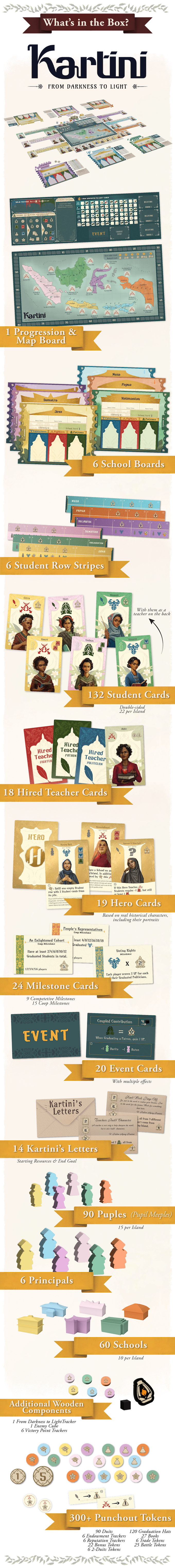 In Kartini - From Darkness to Light, you manage schools for girls where girls from different islands of Indonesia come to be students. As they graduate, the students become politicians, fighters, patrons or teachers, further advancing education for women and supporting the fight for the nation’s freedom. Strategically manage your duits (money) and books to help as many girls graduate from your school while paying attention to your school’s reputation. After four rounds, signifying four years of compulsory preliminary education in Indonesia, the player with the highest points wins the game.