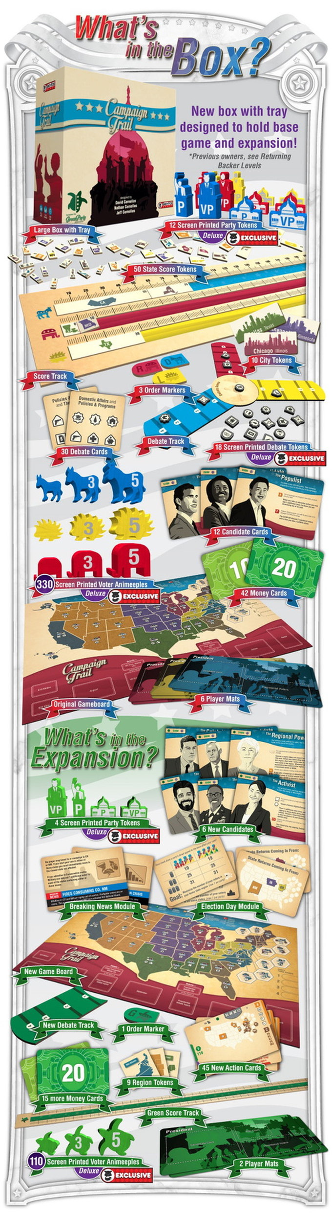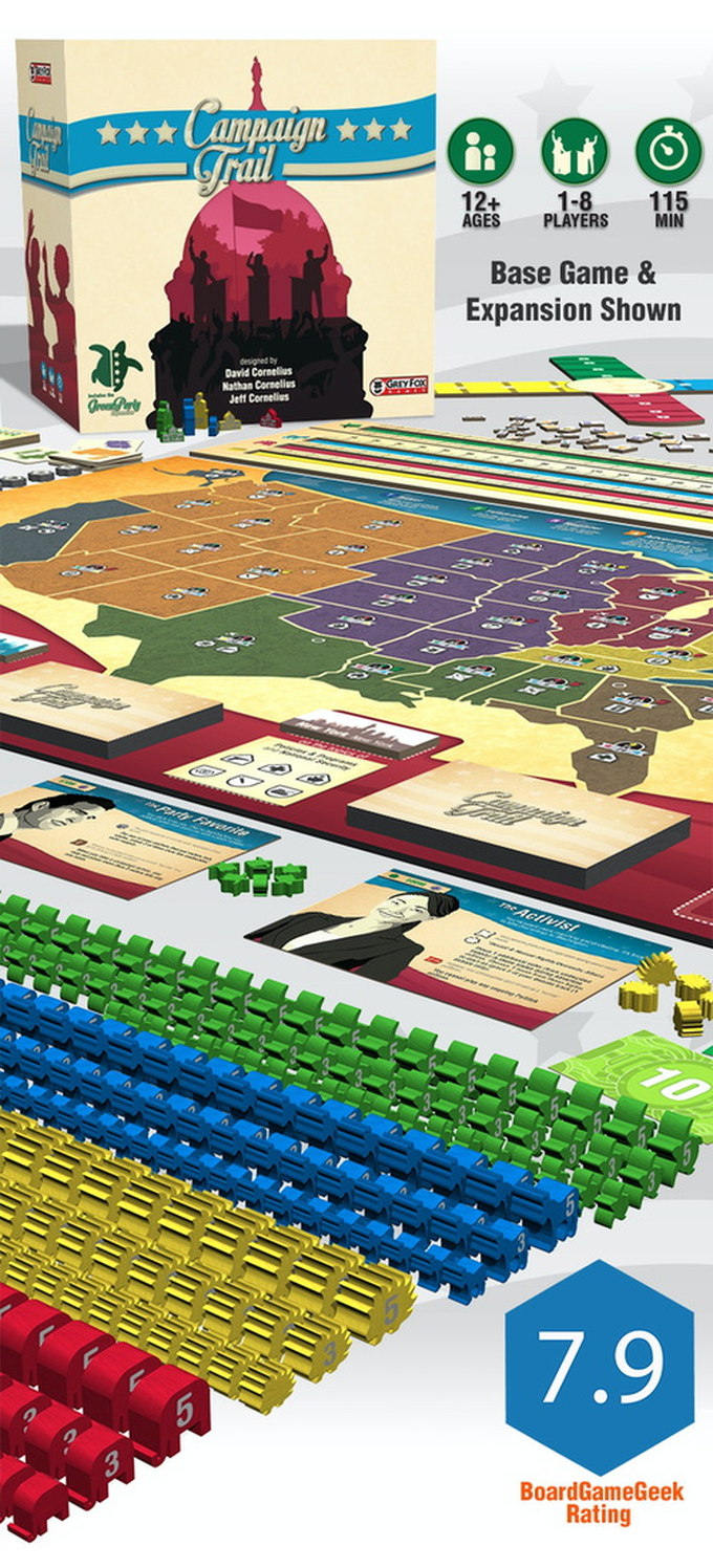 Campaign Trail uses card driven actions to implement your strategy. Your goal is to have the most voters for your party in enough states to win a majority of electoral votes. If you have the most voters in a state you are awarded that state's electoral votes (victory points). At the end of the game the player with the most electoral votes wins and is declared the president!