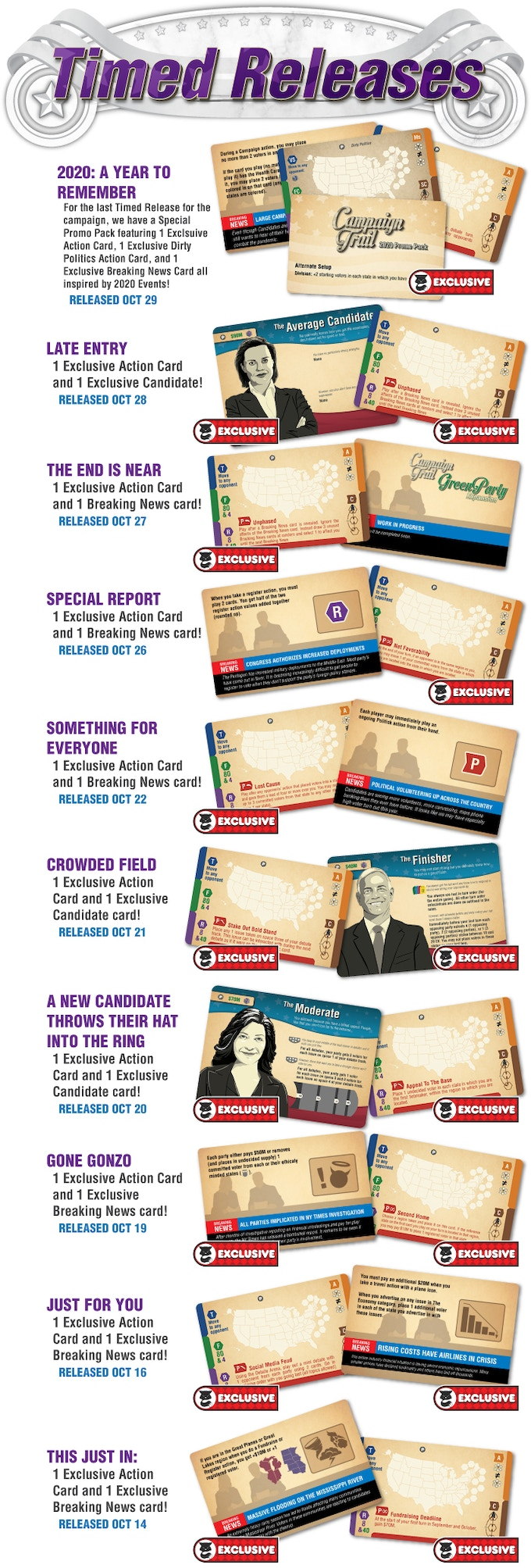 A completely NON-PARTISAN, asymmetrical, card-driven strategy game about winning the U.S. electoral college. We feel it's important in these divided times to note that this game DOES NOT ask you to take real-life positions on political issues. What it DOES do is brilliantly simulate a U.S. election in terms of funding, advertising, campaigning, and debating.