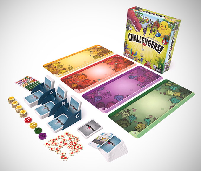 Challengers! is an interactive deck-management game for 1-8 players that plays in about 45 minutes independent of player count. With the tournament gameplay style, you meet another opponent every round.