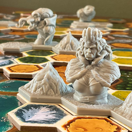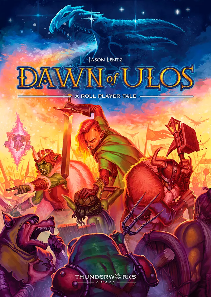 Dawn of Ulos is an economic tile-laying game for 1-5 players set in the world of Roll Player and Cartographers. You compete in a game among gods of the planarverse, wagering on and manipulating the rise and fall of mortals.