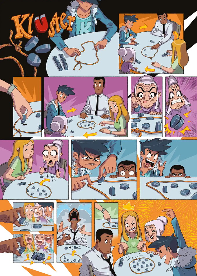 Kluster’s rules can be explain in no time: Magnetic stones are equally shared between players, who must, in turn, place one stone inside the area delimited by the cord. The first player to get rid of his or her magnets wins. But beware, when stones kluster together during one player’s turn, he or she collects them!