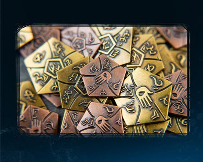A set of 40 intricately designed custom metal coins in two denominations. Intended to be an upgrade and replace the cardboard coins from the game.