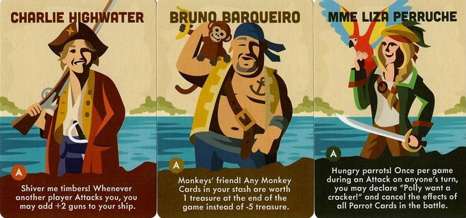 Monkey cards give minus 5 treasure making it so you actually want to lose that battle. Parrot cards copy another of your ship cards allowing you to double down on a strategy or bluff.