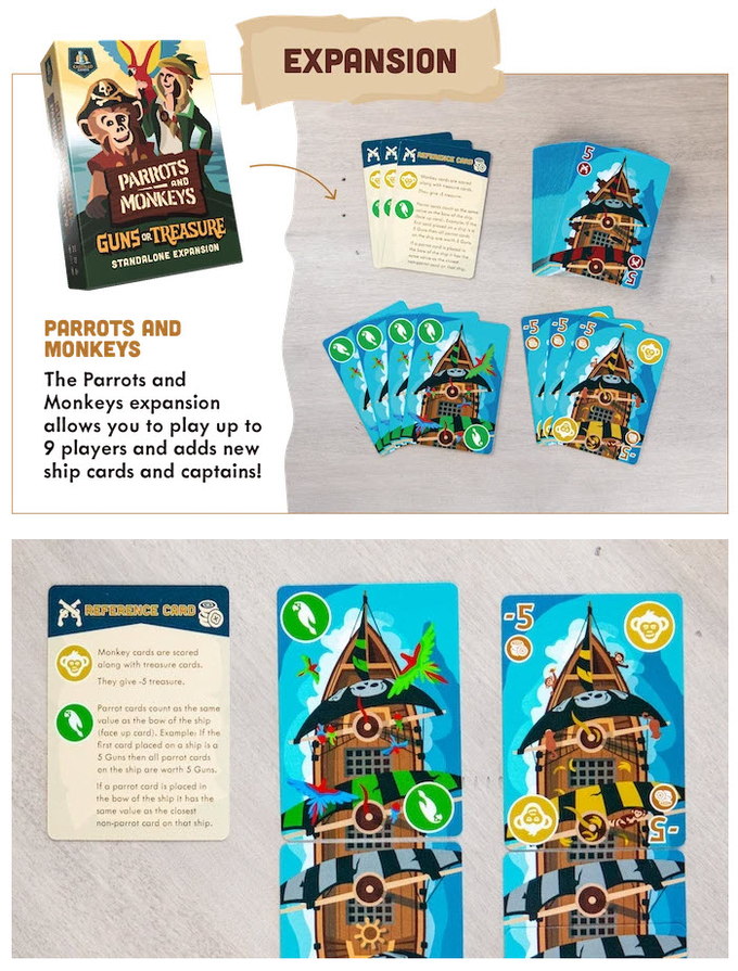 The Parrots and Monkeys expansion allows you to play up to 9 players and adds new ship cards and captains!