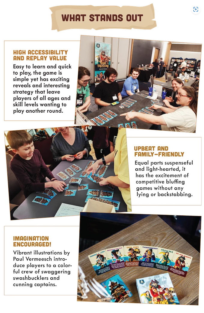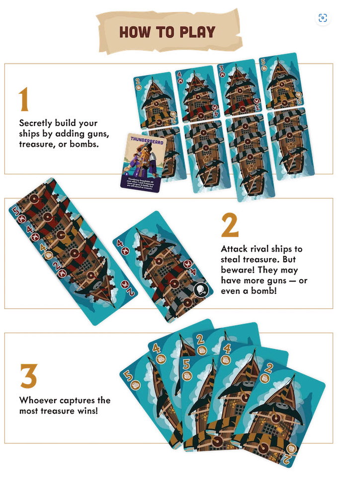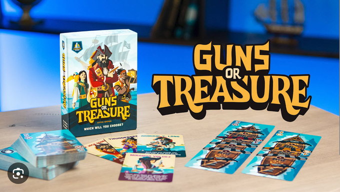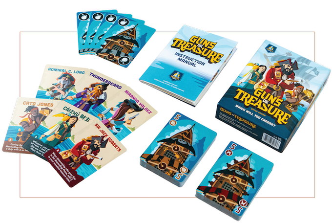 Guns or Treasure is a speedy game of buccaneering and bluffing! It has a beautiful shipbuilding aesthetic, excellent replayability and a wide demographic appeal. Throw it in a purse to entertain your kids or carry it in your pocket to add some rowdy fun to pub time with the guys.