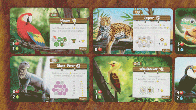 Animals and plants in the Amazon each have their own unique characteristics. Some will provide Environmental Points based on how many trees are in their habitat, how many different animals surround them, or how large their habitat is. Know the characteristics of each Animal and place them in the most optimal location.