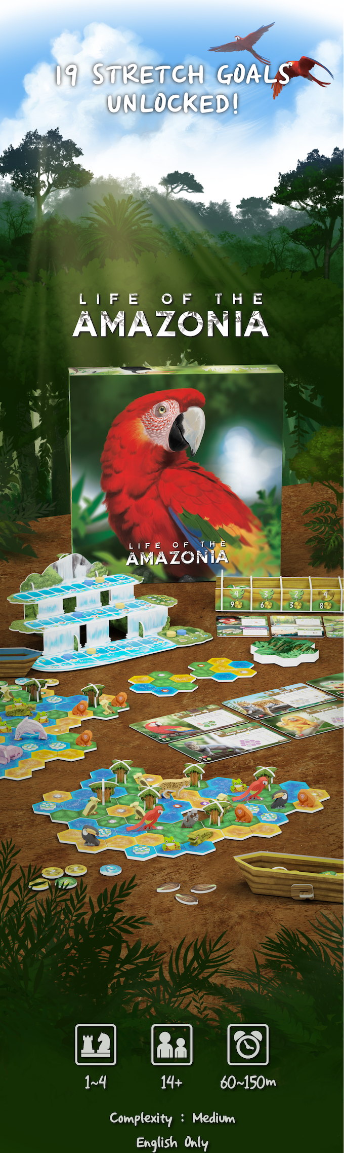 Life of the Amazonia is also available for Solo play. In Life of the Amazonia solo mode, Players play the game against a challenging virtual opponent, Black Comet. Solo mode consists of 9 total scenarios, and each scenario is made up of various prearranged sets and rules to provide varying levels of enjoyment. For more information regarding the Solo mode, please refer to pages 18-21 of our Rulebook.
