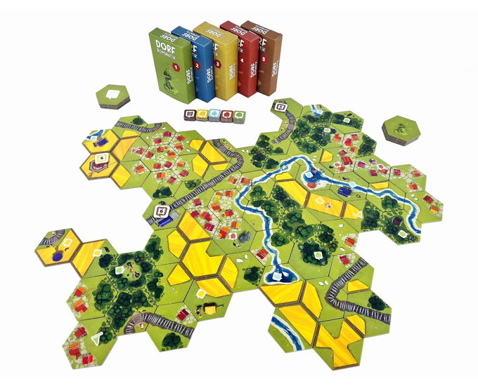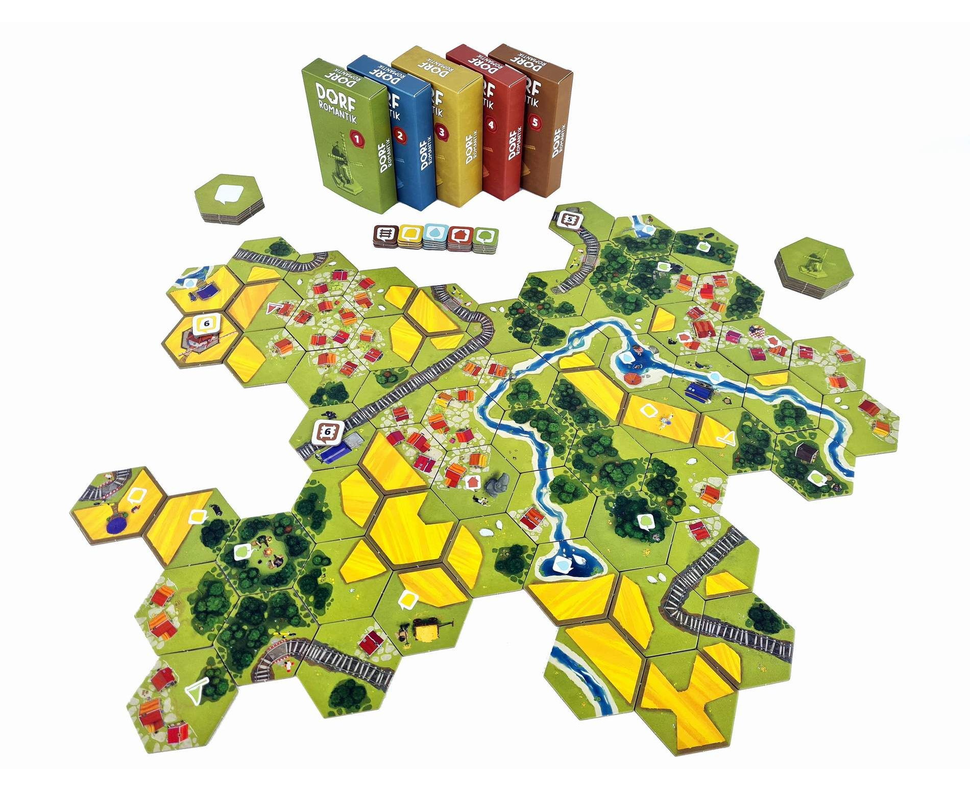 In Dorfromantik: Village Romance – The Board Game, up to six players put together hexagonal tiles to form a beautiful landscape and try to fulfill the orders of the population, at the same time laying the longest possible track and river, but also taking into account the flags that provide points in closed areas. The better the players succeed in this, the more points they can achieve in the end. In the course of the replayable campaign, the points scored can be used to unlock new tiles, which are hidden in initially sealed boxes. These give the players new, additional tasks and make it possible to increase the high score further and further.