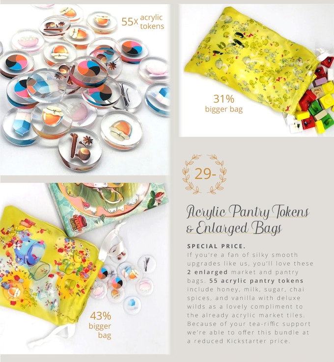 Note: This is the Deluxe Bundle Edition of CHAI and CHAI: HIGH TEA with Metal Coins, Acrylic Tokens and Enlarged Bags, and Acrylic Tip Tokens.