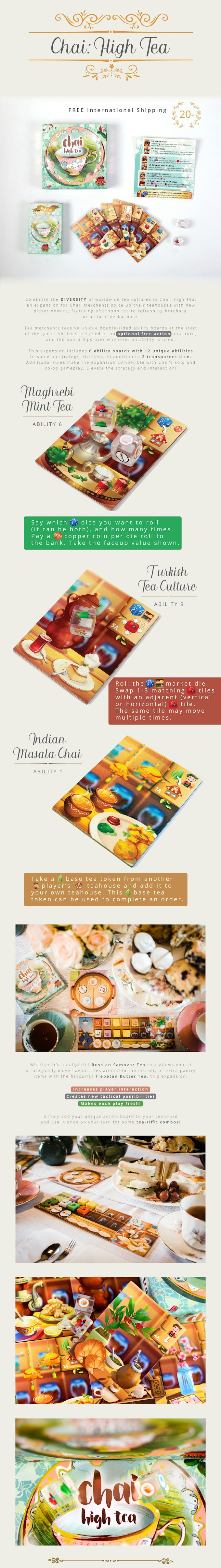 Celebrate the diversity of tea cultures in Chai: High Tea, an expansion for Chai! Merchants spice up their teahouses with new player powers, featuring afternoon tea to refreshing horchata, or a sip of yerba mate.