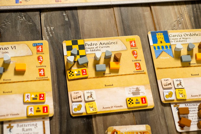 The sides every 40 days will levy various lords and vassals and their forces, transport, and capabilities, backed by higher political authorities. Each lord is rated for fealty, lordship, service, and command and lays out his forces and assets on a mat. Wooden pieces represent units of knights, mounted sergeants, horse and foot units from North Africa, men-at-arms, light horse, militia, and serfs. Assets include counters for transport such as carts and mule trains; provender to feed the army; and coin to pay for longer service or loot captured by ravaging or conquering enemy regions.