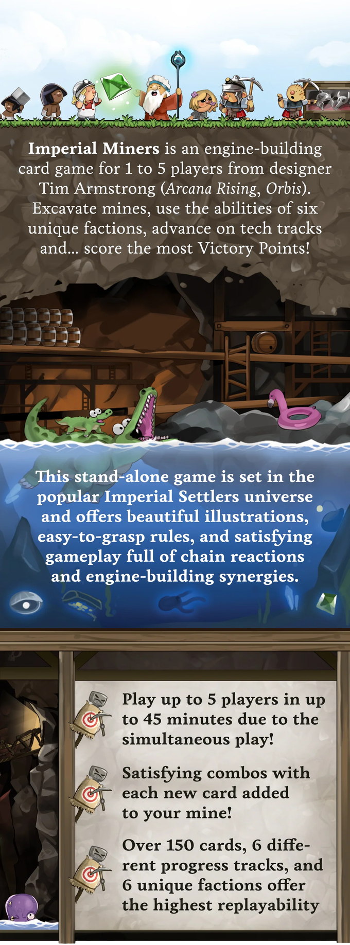 Imperial Miners is a light engine-building card game for 1 to 5 players from designer Tim Armstrong (Arcana Rising, Orbis), in which players excavate mines using a clever card activation system. This stand-alone game is set in the popular Imperial Settlers universe and offers beautiful illustrations, easy-to-grasp rules, and satisfying gameplay full of chain reactions and engine-building synergies.