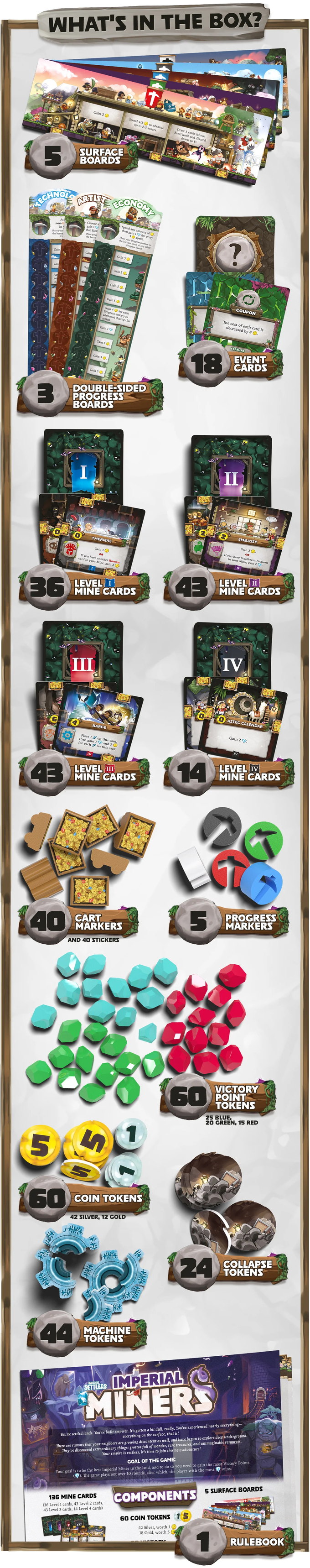 Imperial Miners offers impressive replayability thanks to its wide range of different cards and modular progress boards. Players also take turns simultaneously so gameplay is quick and lasts no longer than 45 minutes. The straightforward rules, beautiful artwork, and rewarding engine-building mechanisms make a perfect game for both casual and experienced gamers.