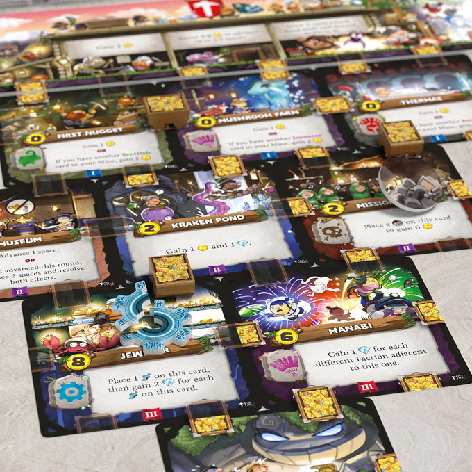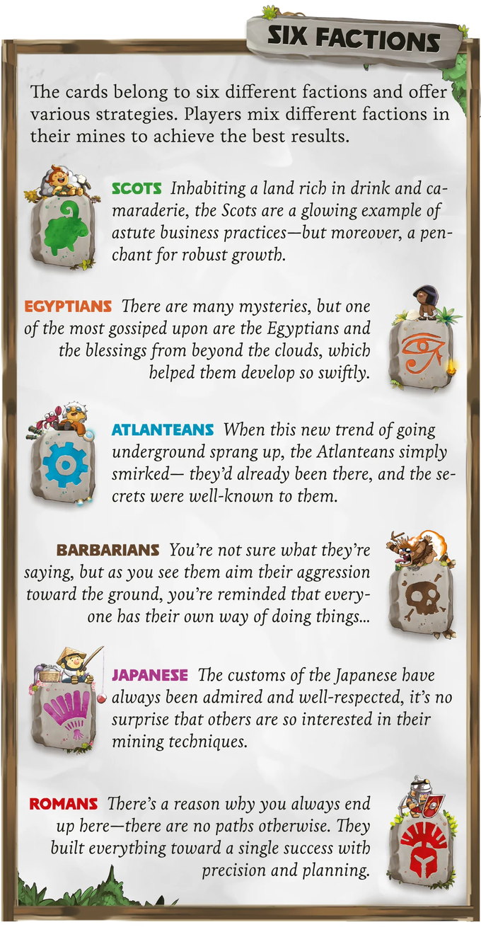 In Imperial Miners, players create their own mines by playing cards into their personal tableau. They start from the surface and develop downward. Each time a card is added to their mine, it activates itself and all the cards above it, rewarding a player with satisfying chain reactions and combos. The cards belong to six different factions and offer various strategies. Players mix different factions in their mines to achieve the best results.