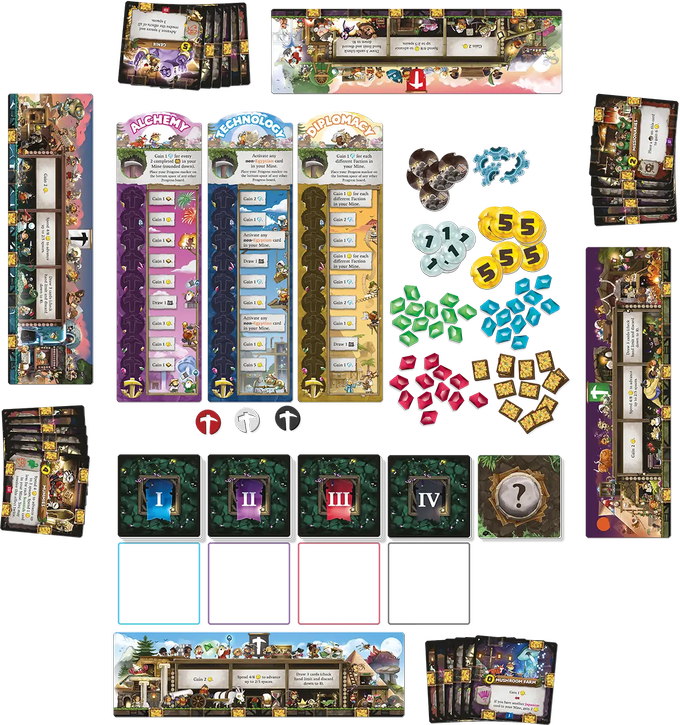 While developing their mines, players also advance on progress boards. During set-up, three out of the six available progress boards are randomly chosen for the game. These boards each offer a different strategic focus. Throughout the game, players advance to gain additional bonuses that help them develop their tableaus, activate the synergies between cards, gain victory points, and achieve even more satisfying combos. The combination of progress boards influences strategies and makes the game different each time you play.