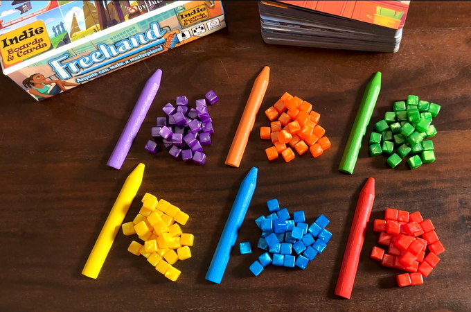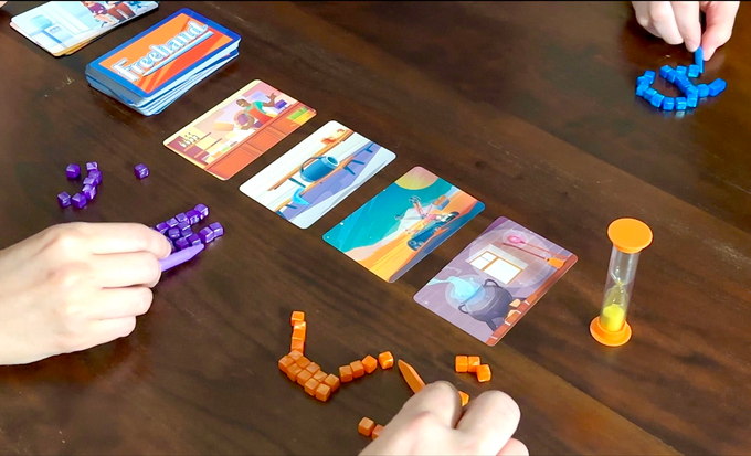 The players must use a wooden “artist’s pen” to push around mini cubes, and make an abstract masterpiece that evokes the image card they chose.