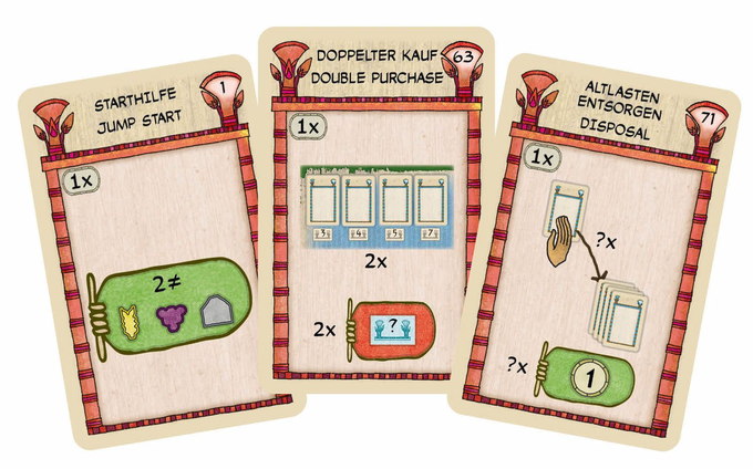 This first expansion for Faiyum offers privileges, that you keep separate from the cards in your hand. The permanent effects change or add to the effects of your action cards, while onetime effects usually offer actions you can use once in addition during your turns.