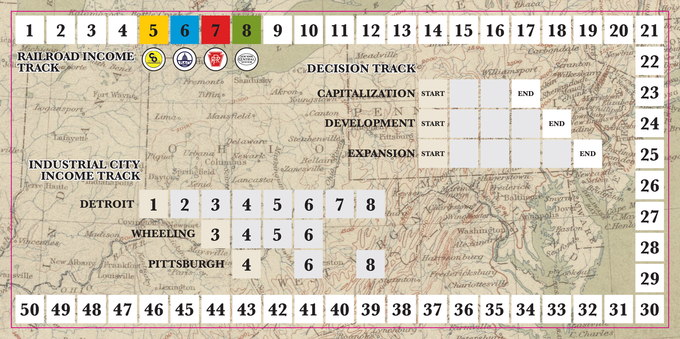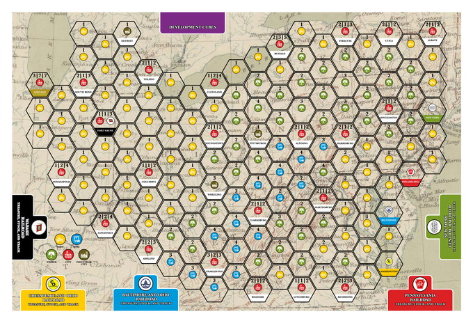 Players vie for dominance in the creation of America’s seminal railroads: The Pennsylvania, the Baltimore & Ohio, the Chesapeake & Ohio and the New York Central. They also increase their wealth and stock value by developing cities along the right-of-way.