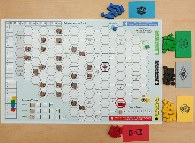 In Texas & Pacific, 2-6 players represent wealthy investors and ranchers in the 19th-century U.S. Midwest and Texas. Players buy stock certificates from the major railroads of the era. They compete to earn the most money during the game by carefully timing dividend payments and expanding the railroads across the plains to increase the value of their holdings. At the end of the game, the player with the most money wins.