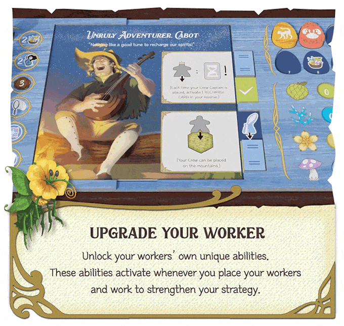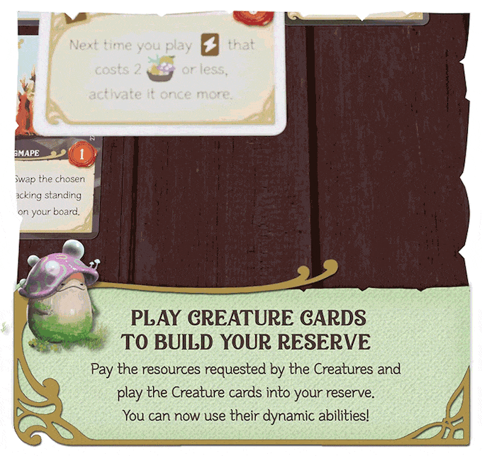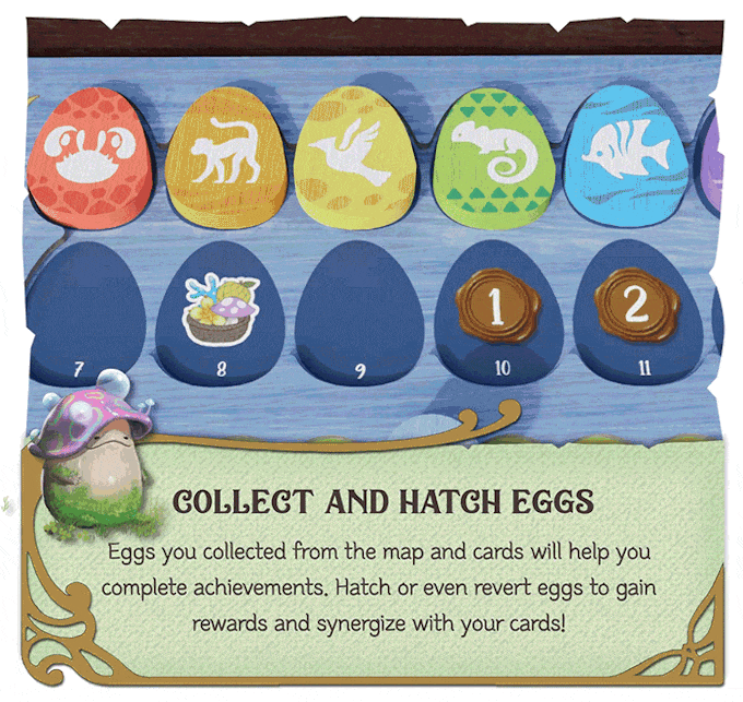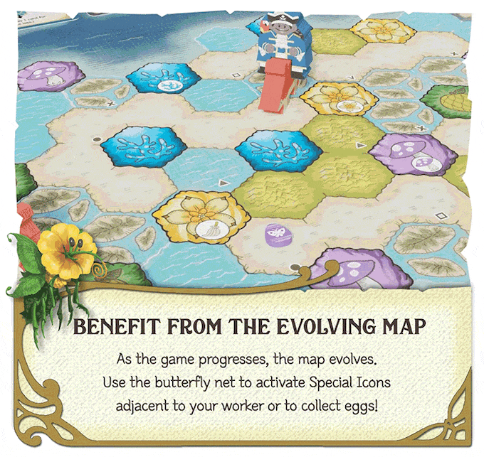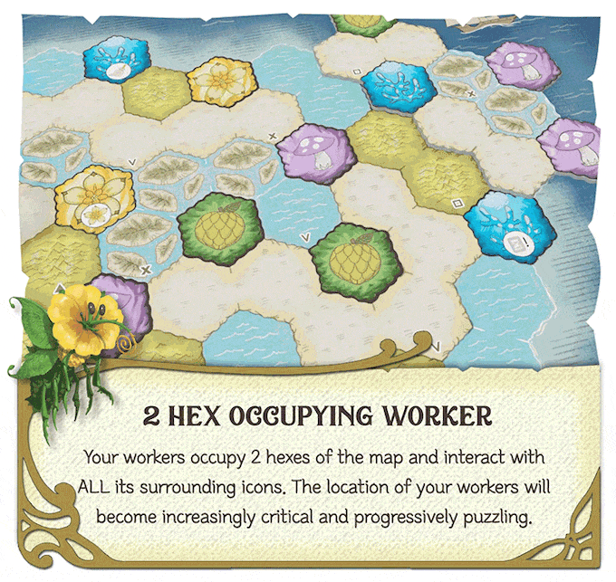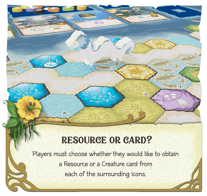Unique Worker Placement: Wondrous Creatures’s worker placement mechanism provides an intriguing Hex Puzzle experience. Your deployed worker interacts with surrounding icons to bring in resources or cards, and works to activate special effects!