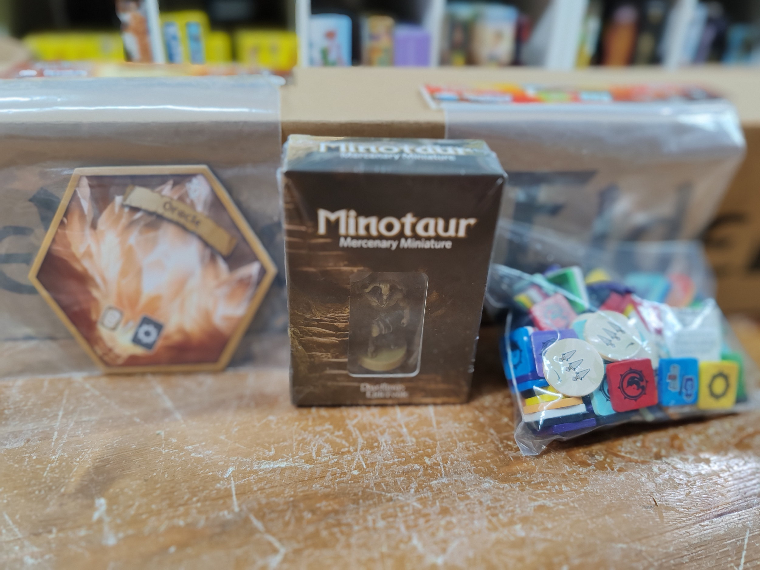 The Minotaur is a Mercenary mini expansion for Dwellings of Eldervale that has always been available separately. Included are the Minotaur miniature, standee, and corresponding game card (with sweet art!). Rules for play are included in all versions of the rulebook.