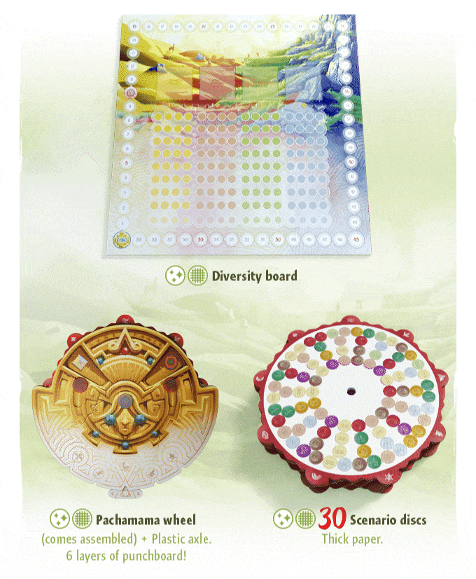 Each scenario disc indicates a unique arrangement of terrain tiles and crop tiles. Terrain tiles are in regions of 1-5 spaces, and a region of one color does not touch a region of the same color, even diagonally. Crop tokens have a value of 1-5, and each value has a different size/color (level 1 is brown, level 2 is green, etc.). A size 1 region will contain a value 1 crop token, a size 2 region will contain crop tokens of value 1 and 2, and only a size 5 region will contain crop tokens of each value. Two identical crop values can never be adjacent, even diagonally.