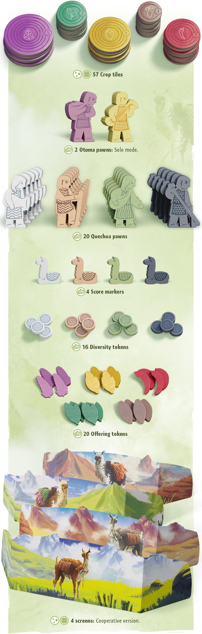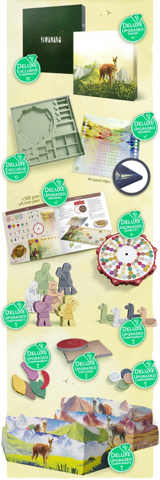 - Deluxe comes with uniquely designed wooden Quechua & Otoma meeples with screen printing for each colour. Retail edition comes with identical wooden meeples for all colours and no print.