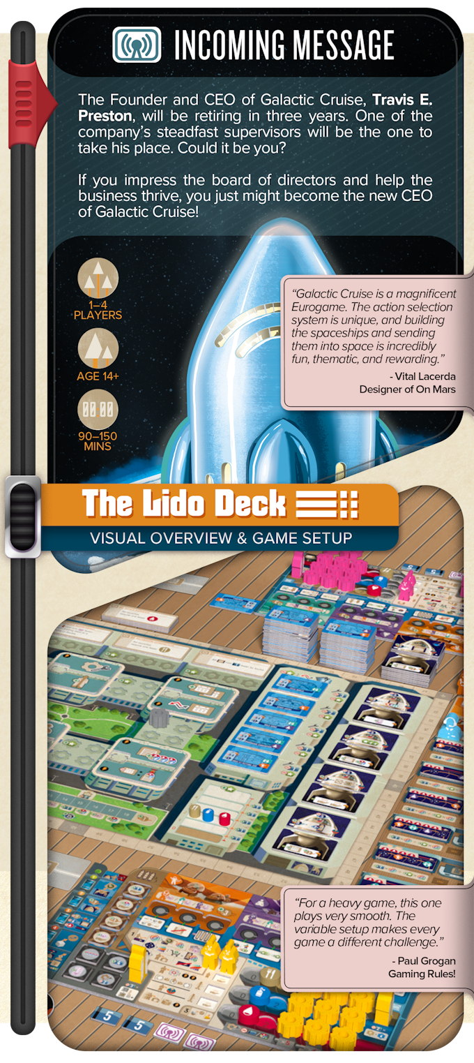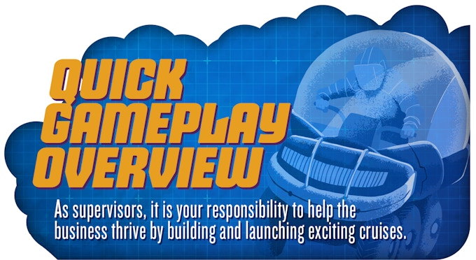 Hello, and welcome to Galactic Cruise. Here, we offer our guests something special: the comfort of a luxury cruise with the innovation of space travel. As the first company to offer extended-stay space vacations, we are excited to have you working for us! As a supervisor of this company, you’ll be expected to not only build these shuttles and satisfy our guests, but also to help the company thrive by enhancing our company network, inventing new technologies, and growing our workforce. We are a united company, and you’ll often find that what another supervisor does will make your job easier. Let me be clear, though, this is a competition. The supervisor who comes out on top will become CEO of the company.