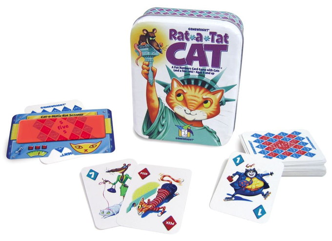 Get rid of the rats and go for the cats! In Rat-a-Tat Cat, less is always better, and you want to go out with the lowest score. Can you remember the numbers on the other players' cards? Can you keep a poker face, but notice when another player looks pleased? Sharpen your memory and your timing, and have fun with the cool cats and bad rats of Rat-a-Tat Cat. This is the Gamewright version.
