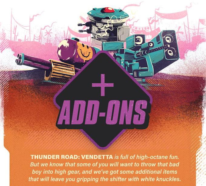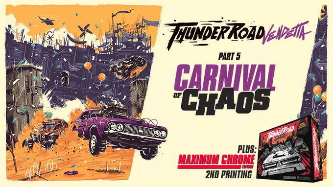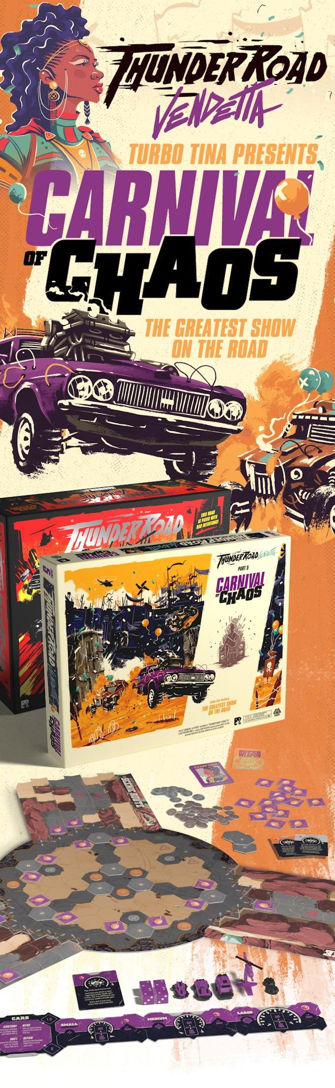 Carnival of Chaos is an expansion for Thunder Road: Vendetta (or Thunder Road: Vendetta – Maximum Chrome) that offers a new way to play. Players race their cars into the arena, collecting wild party favors, powerful super-weapons, and precious scrap along the way. This expansion also includes a full set of vehicles and a dashboard, so you can play with a fifth player using this expansion or in the regular game.