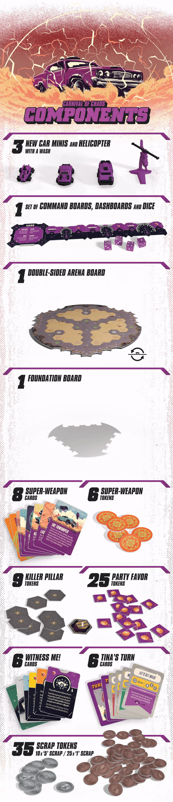 Carnival of Chaos includes a 5th-player color (purple! with the wash treatment) to play with five car crews. Or bring in the existing expansions with the Final Five, the dangers of Carnage at Devil's Run, and the crew leaders and upgrades from Choppe Shoppe.