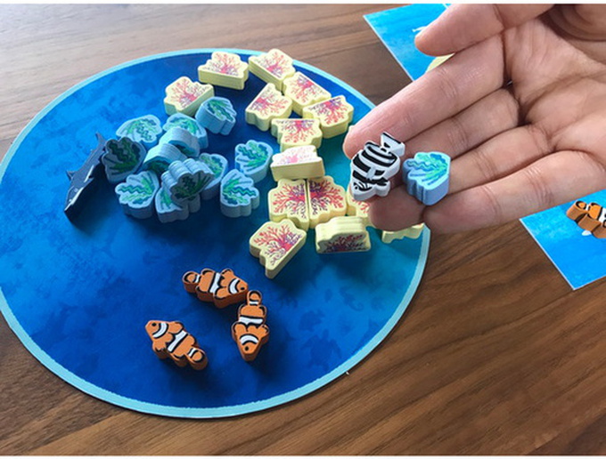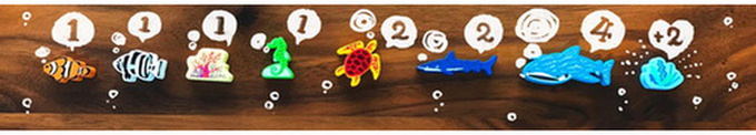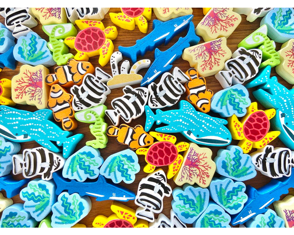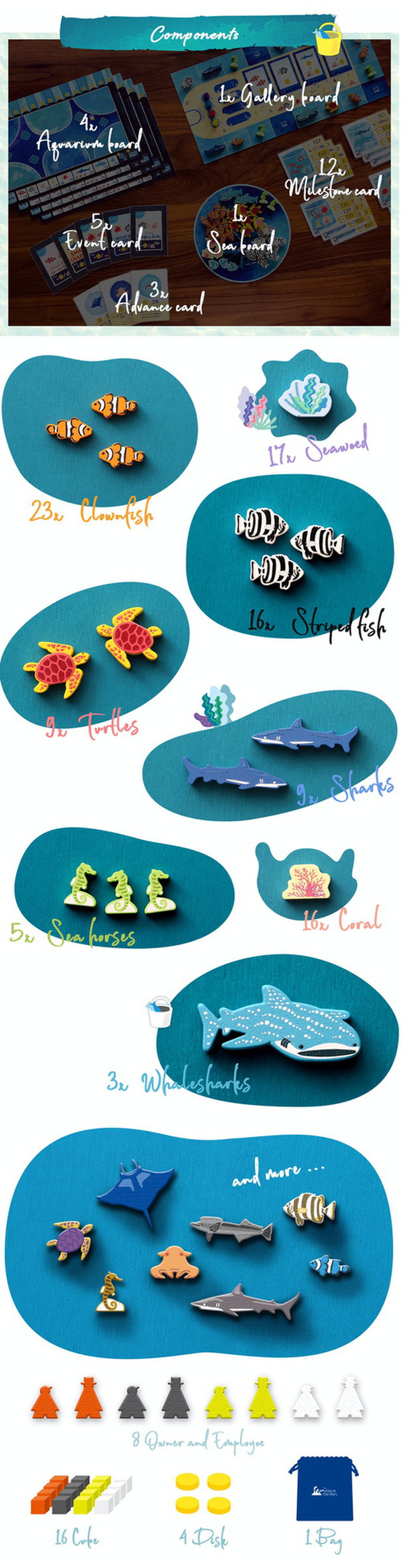A game lasts 3-4 rounds depending on the number of players. You have your own aquarium board with six tanks, and a shared player board has sea creatures placed at random on its perimeter. Seaweed and coral tokens are placed on the separate sea board, along with five random sea creatures.