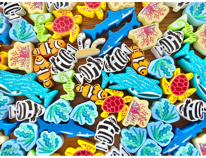 Each tank has only 4 units of oxygen available, so you can't add creatures to a tank that would consume more oxygen than this. You can add one seaweed to each tank, however, to increase the available oxygen to 6. You must also observe other placement restrictions, such as keeping sharks separate from fish and sea turtles. Additionally, you can pay to purchase creatures, seaweed, and coral from the sea board.