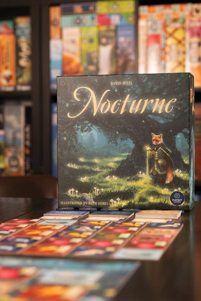 Nocturne is a puzzly spatial bidding and set collection game of sly mystics set in a whimsical moonlit forest illustrated by Beth Sobel!