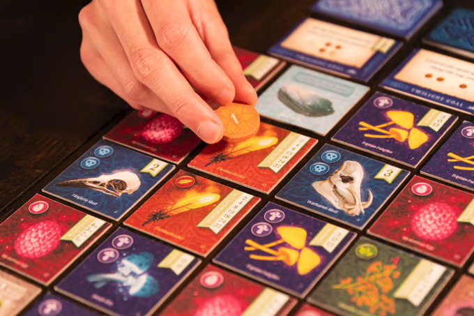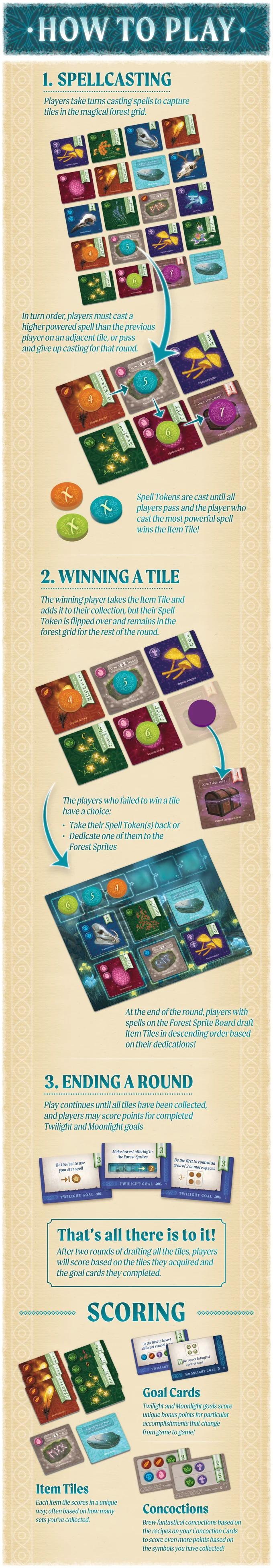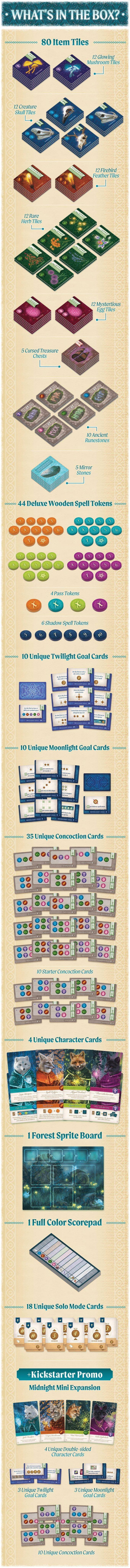 Through two rounds (twilight and moonlight), players compete to collect the strongest sets of magical items like firebird feathers, creature skulls, glowing mushrooms, mysterious eggs, and rare herbs. These items have value when collected in specific sets, but can also be combined to fulfill recipes needed for concoctions, scoring you even more prestige!