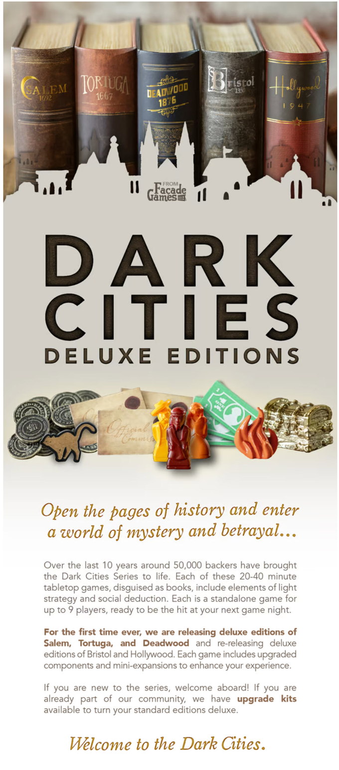 This standalone game is Volume 4 in the "Dark Cities Series" by Facade Games following Salem 1692, Tortuga 1667, and Deadwood 1876.
