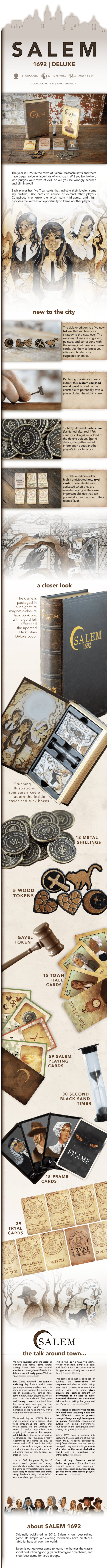 Salem 1692 is a light strategy and social deduction game for 4-12 players, and is Volume 1 of the DARK CITIES Game Series.