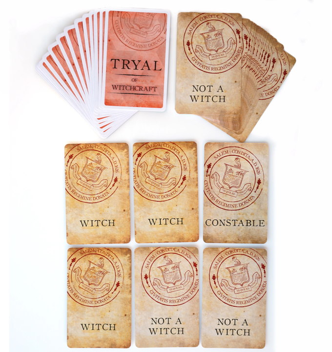 Players, each acting as one of these unique characters, are given 3-5 Tryal cards (depending on the number of players). These Tryal cards reveal the true identity of each player, "Witch" or "Not a Witch."