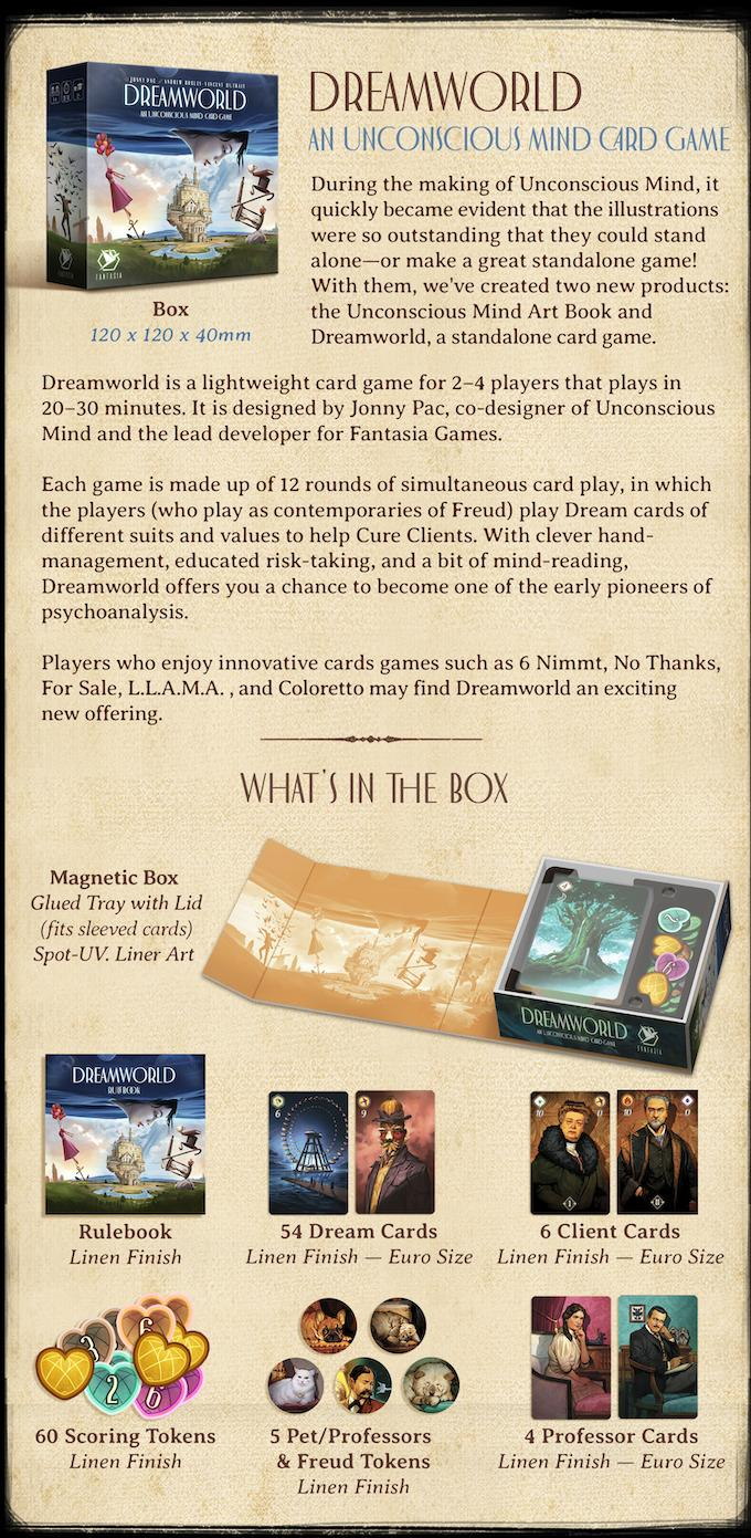 Dreamworld is a lightweight card game for 2–4 players that plays in 20–30 minutes. It is designed by Jonny Pac, co-designer of Unconscious Mind and the lead developer for Fantasia Games.