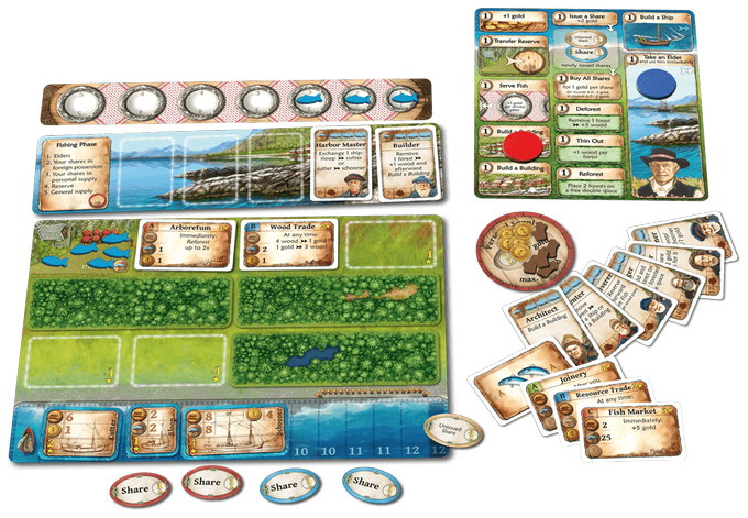 As with Agricola and Ora et Labora, Nusfjord has a worker placement mechanism, with each player starting with three workers that they place on a central board to trigger certain actions. Whether a player wants to clear a forest on their own board, buy a new cutter, or construct a building, they must place a worker on the appropriate space — which is possible only if room is available for this worker. Money is scarce, and one of the quicker and easier ways to get it is to place shares of your own company on the market. This risky action could be worthwhile because if you succeed in buying these shares yourself, you have usually won money and not suffered any disadvantages; however, if an opponent acquires these shares, then you must allow them to benefit from your hard-earned catches at sea. The village elders might want their own share of your catch as well, especially if you've visited them to take certain actions in the village, so if you don't take care, your catch could end up entirely in the hands of others and your camp will be empty.