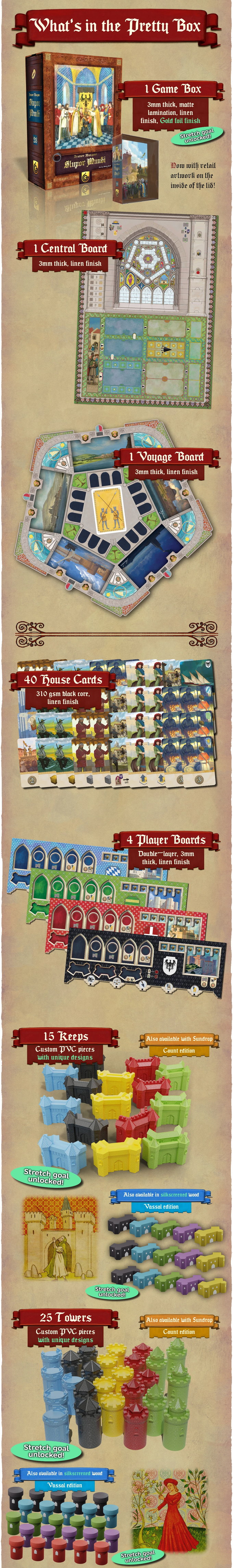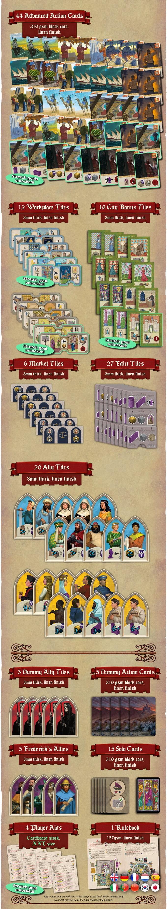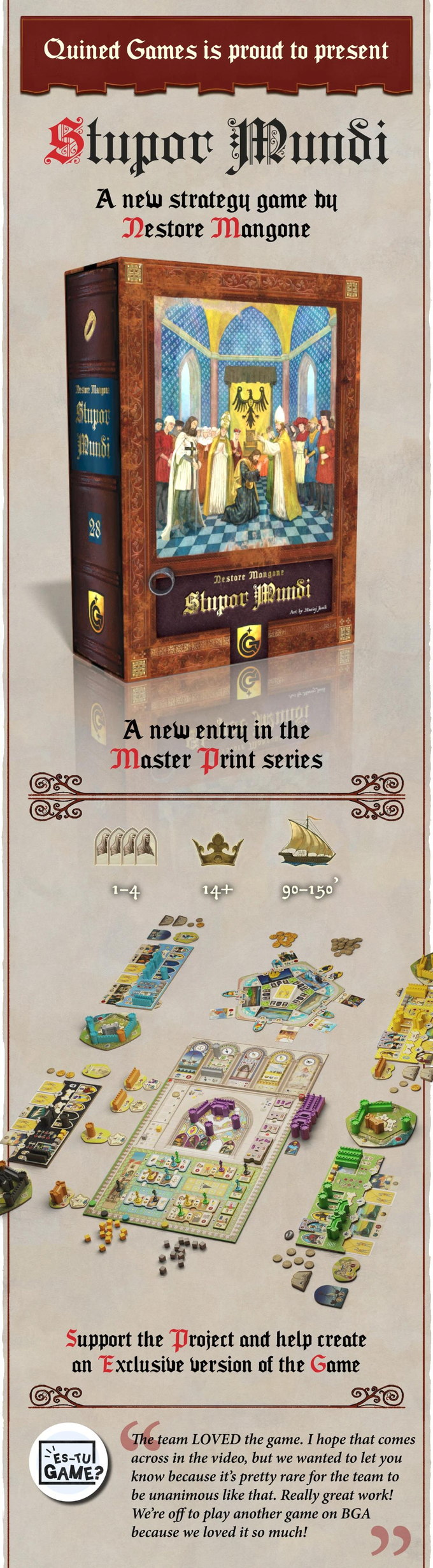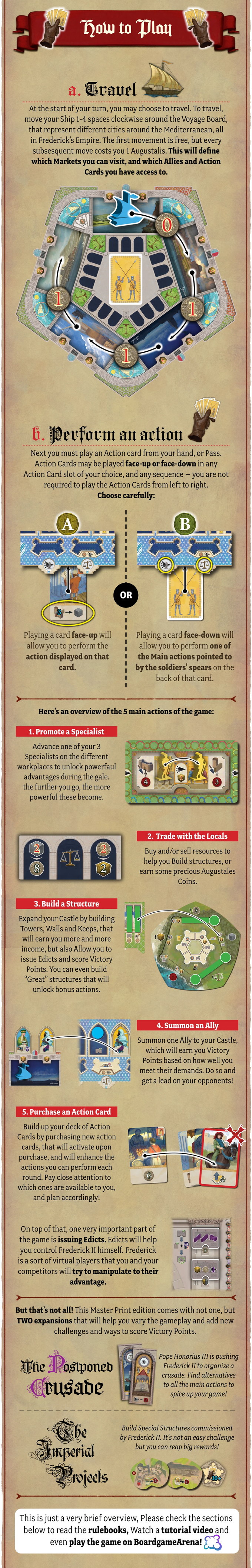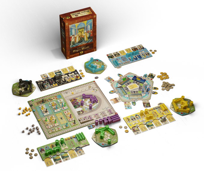 As one of Frederick II's vassals in Stupor Mundi, you will summon allies from around the Mediterranean, build structures in your castle, and promote specialists to improve your kingdom. You may improve your chances by upgrading your castles: towers house additional allies, walls store more resources, and keeps aid in managing action cards. Through a clever card-selection mechanism, you will have to choose actions carefully, some of which will trigger edicts that affect Frederick's palace, and determine the rewards players may receive from their allies. Do you stay loyal to the Emperor, or do you support independent allies? Keep a close eye on what your opponents do and form alliances at the right time — or go your own way when things get too heated...