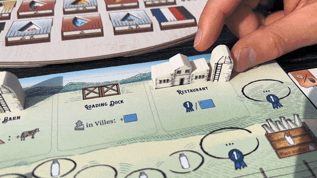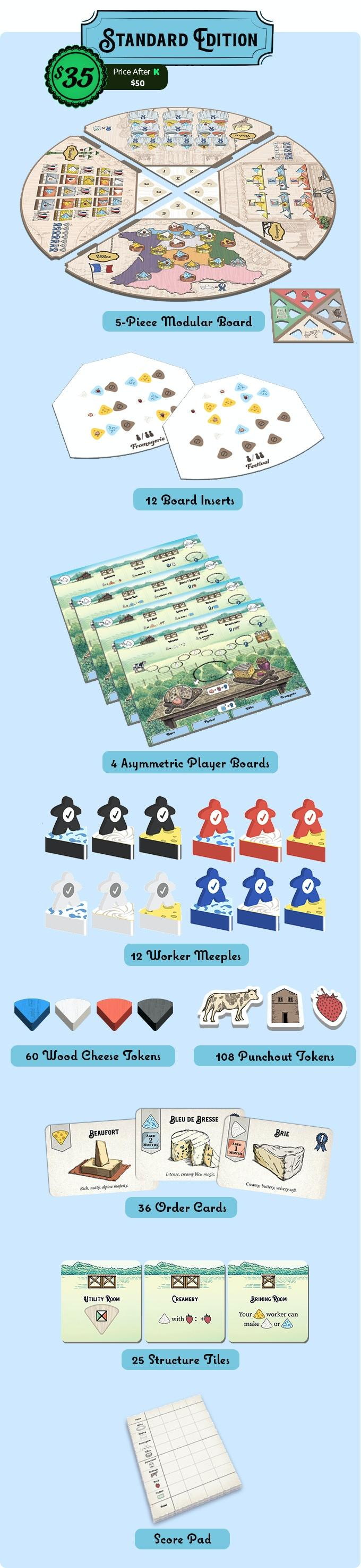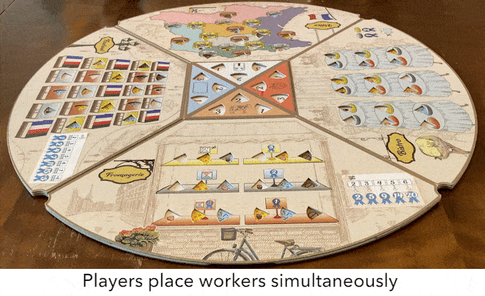 Fromage is a simultaneous worker-placement game where players place Workers to make cheese and gather resources from the quadrant of the board facing them. Once all players have placed their Workers, the board rotates, aging any cheese that was made, and presenting each player with a new quadrant to place Workers into. Score Prestige Points by selling cheese to the four locations, and by efficiently managing and upgrading your creamery.