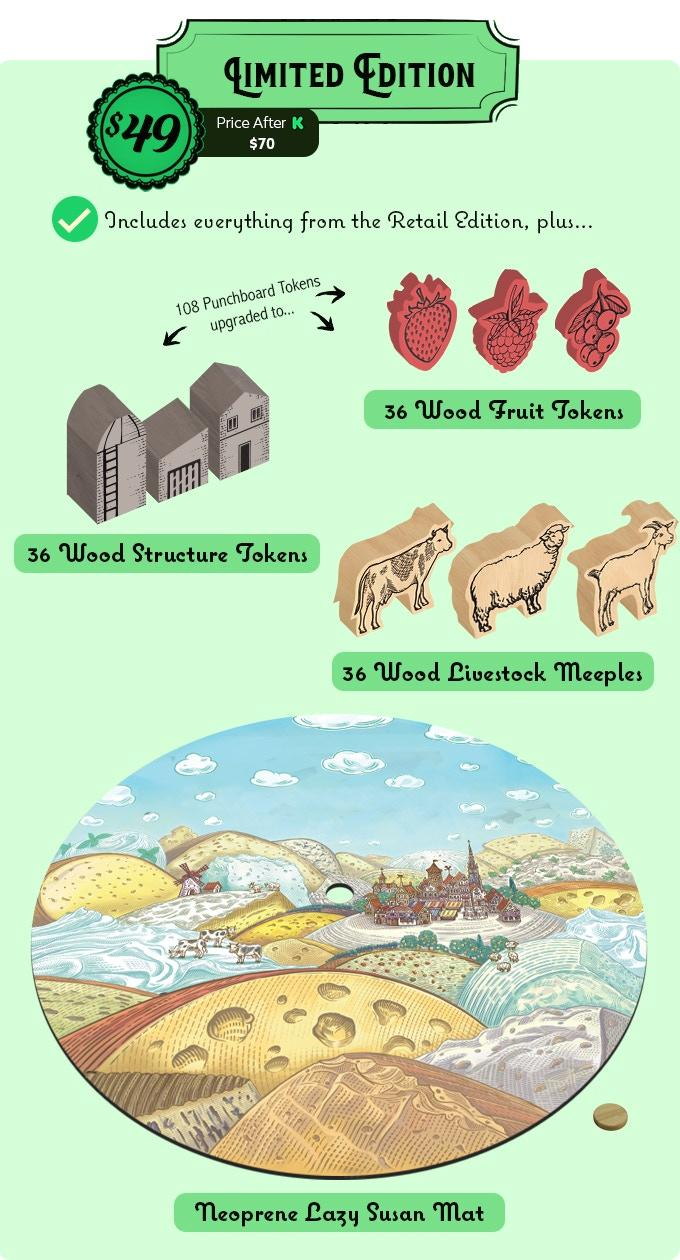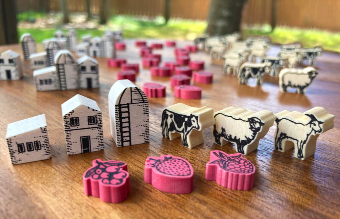 168 Wood Tokens. The Structures, Fruit, and Livestock tokens come in a variety of shapes (Limited Edition Only).