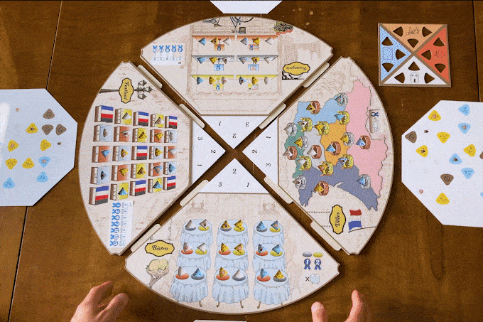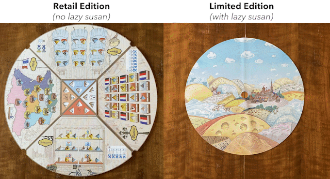 If you back the Limited Edition, you'll get a play mat to put under the board. It allows for a one-finger push for an even smoother and more satisfying spin. A wood disc keeps the board centered on its axis (like the The Search For Planet X board). Also, the mat rolls up and fits in the game box!