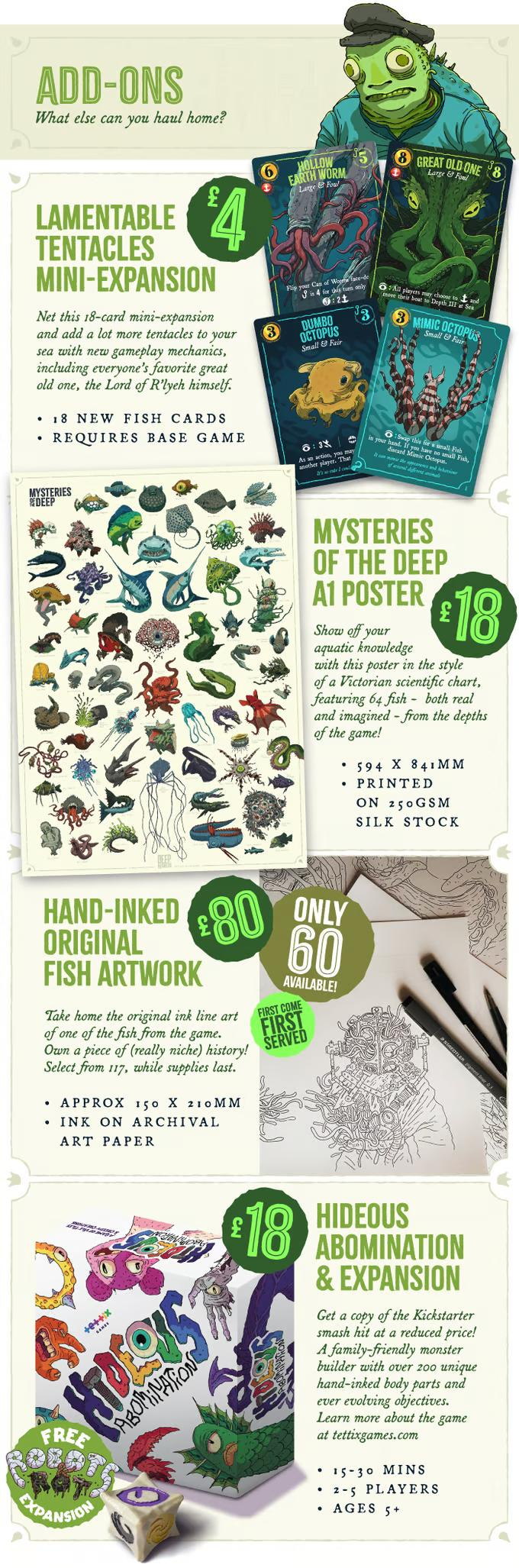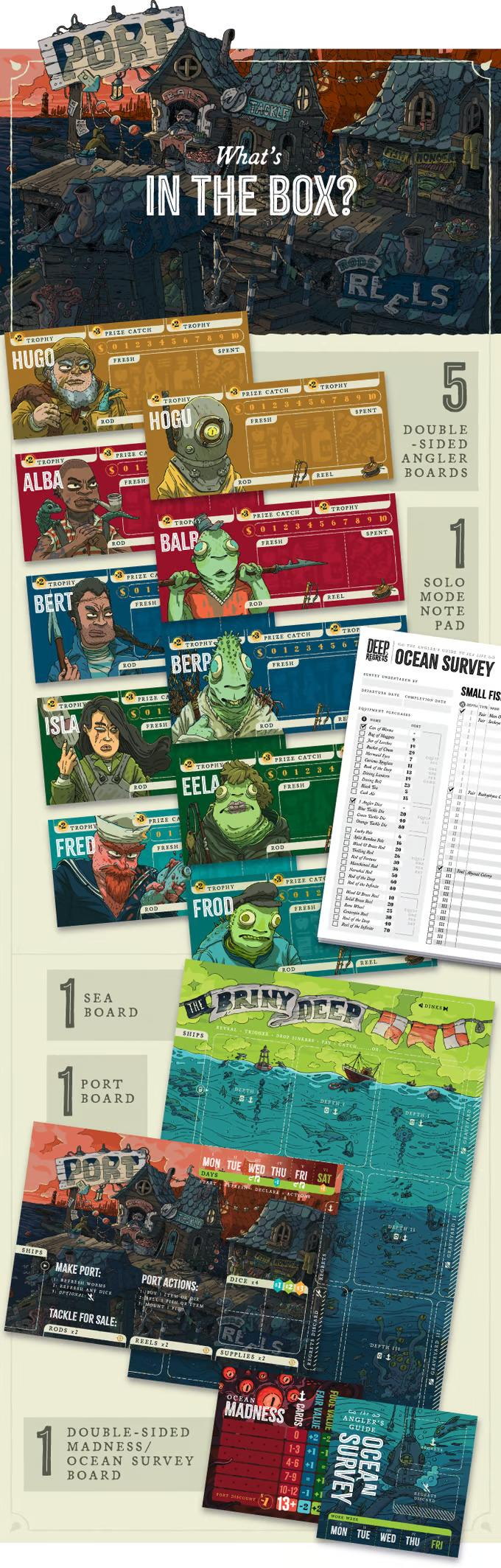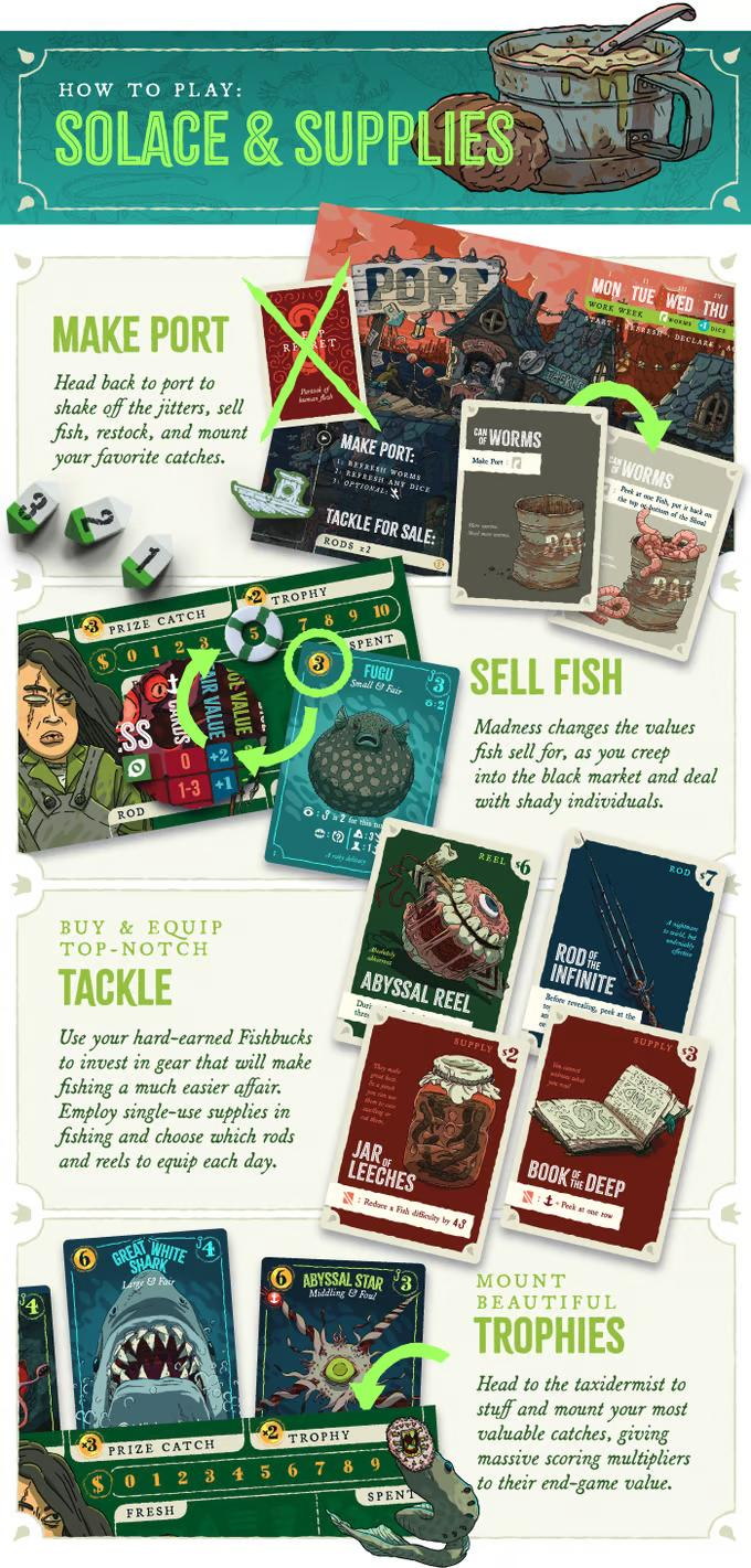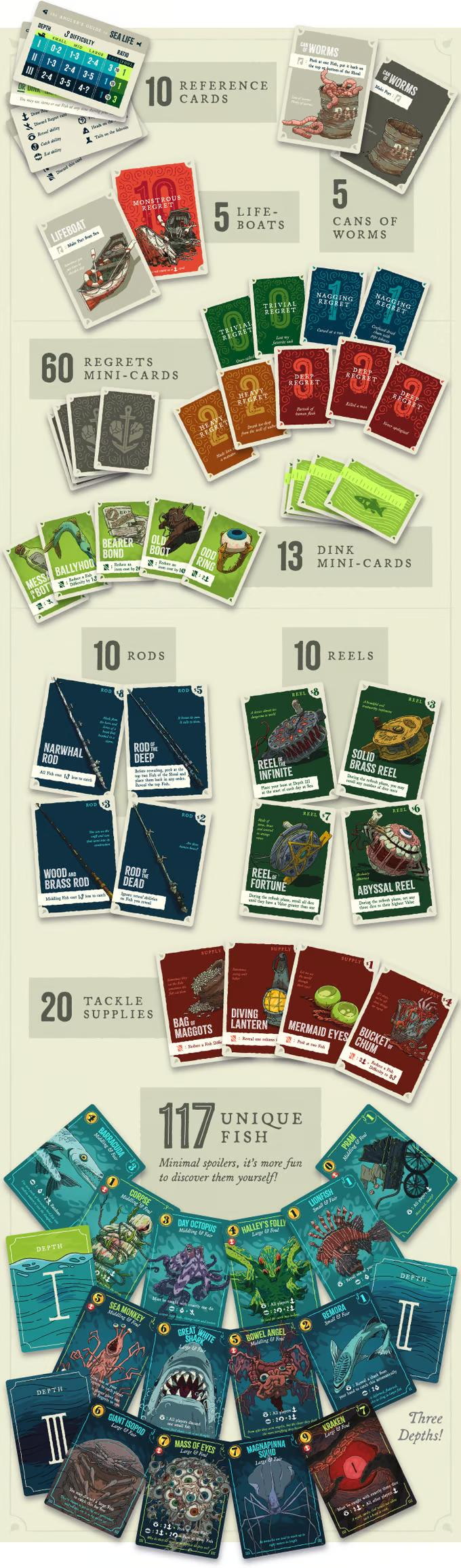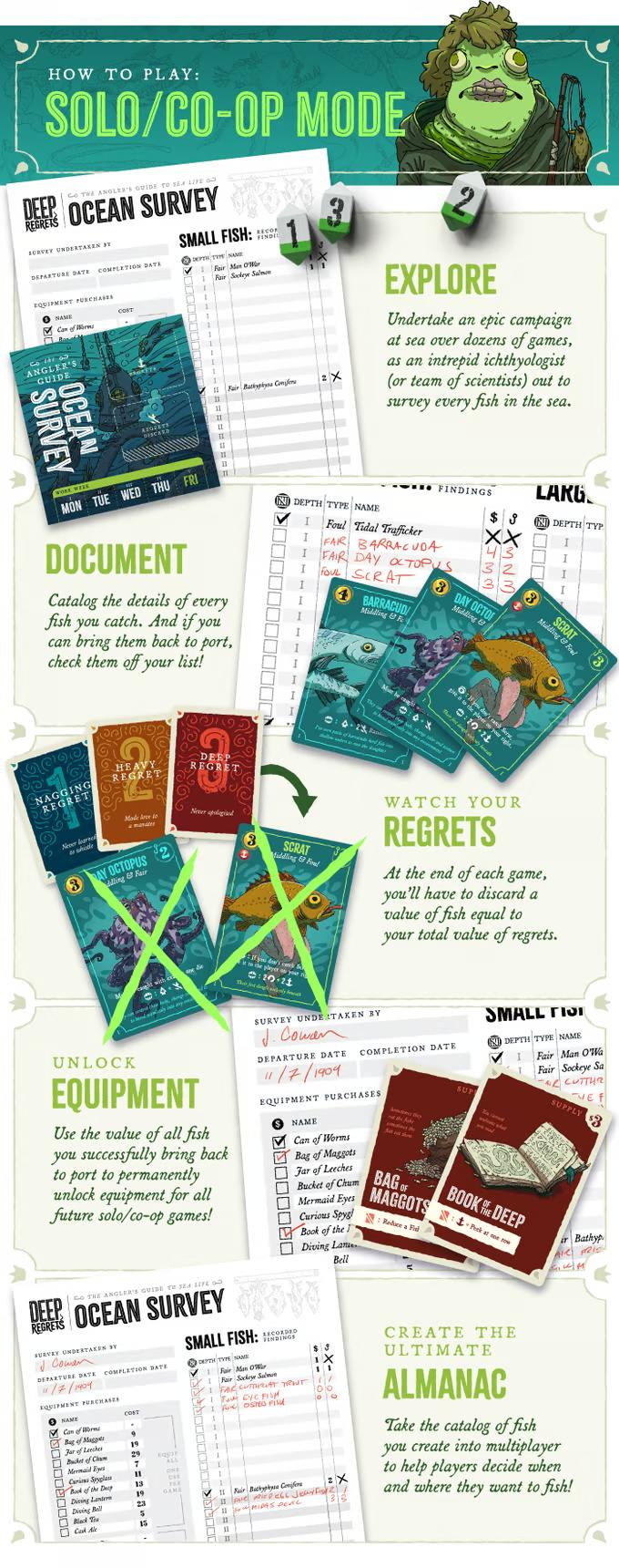 In the solo mode (which you can also co-op), you'll act as an ichthyologist on a mission to catch and catalog every fish in the sea. Over a campaign of dozens of games, you'll try to reel in every last fish and document their attributes on provided catalog sheet. At the end of each game, you'll have to discard an equal value of fish to the regrets you've collected and may have to let some fish go to return to another day. At the end of the campaign, you'll have a catalog of all fish names, depths, values and difficulties that can be used by players in the multiplayer game to help identify what they might fish up!