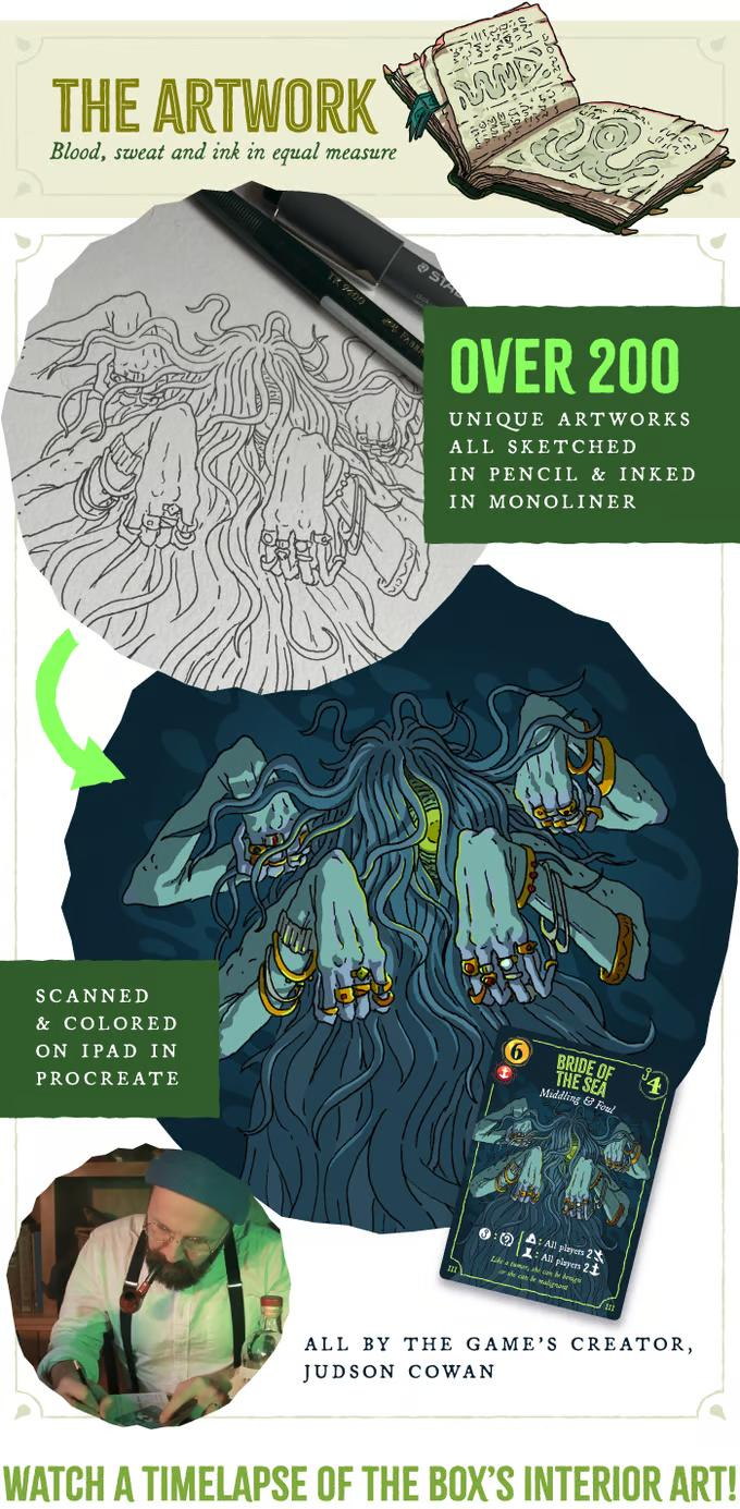 Each fish, item and character has been meticulously hand-inked by illustrator Judson Cowan, then colored by hand in Procreate. It's an absolutely gorgeous world with many, many dark surprises to uncover.