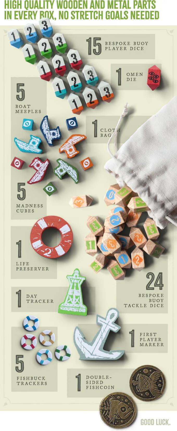 You'll roll bespoke tackle dice at the start of each turn to determine your strength for that round and then decide whether you'll stay at sea or return to port to sell fish, buy provisions, and recharge your energy.