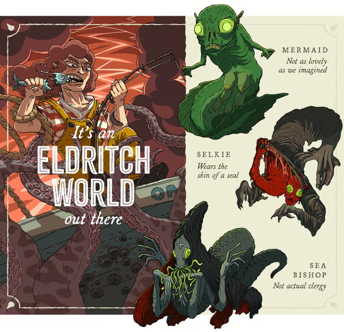 Inspired by stories like The Shadow Over Innsmouth, John Langan’s The Fisherman, the Hellboy series and video games like Dredge and Bloodborne (and maybe a dash of Scooby Doo), Deep Regrets is set in a fictional version of early 1900s Europe where Edmund Halley’s Hollow Earth theory just might have been correct. It’s a world of lonely anglers with heavy regrets weighing on consciences and gruesome monstrosities weighing on fishing lines. Unsavory takes on classic British and European folklore haunt the waters. Strange occurrences have upset the natural balance and made the seas a dangerous place for folk who depend on it for their trade.